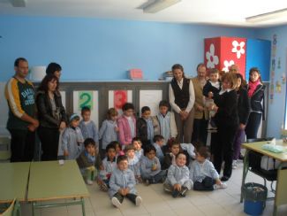 Después de los saludos obligados y algunas presentaciones alrededor de un café, tal y como nos lo organizó “el tío Paco”, partimos hacía el Colegio donde a la llegada y, en el patio de este centro, no estaban esperando entre otras personas la Sra.Alcaldesa D.ª Juliana Fernández de la Cueva Lominchar, el Director del colegio D. Román Pastor Martínez…y, entre la multitud abriéndose paso, los papás de Adrián ,Rosi y Miguel que, ante la expectación levantada por la visita tan especial de la Infanta Elena más todas las Fundaciones antes citadas y las demás personas que las acompañábamos, al ser avisados de nuestra llegada y al vernos rompieron en lágrimas primero, por la sorpresa y segundo, por la emoción causada.